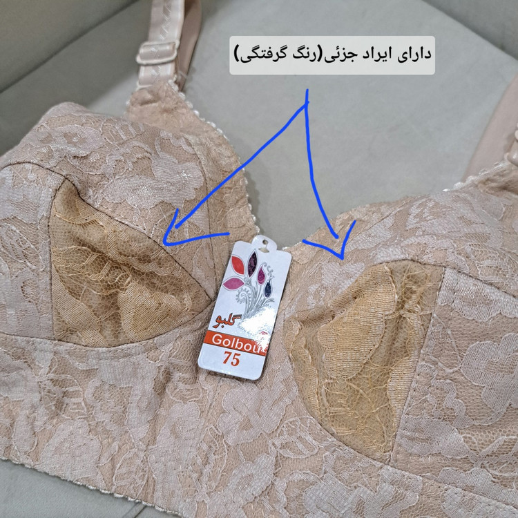 سوتین گیپور زنانه سایز 75 تک سایز و تک رنگ دارای ایراد جزئی که در تصویر مشاهده می کنید یک رنگ گرفتگی می باشد.